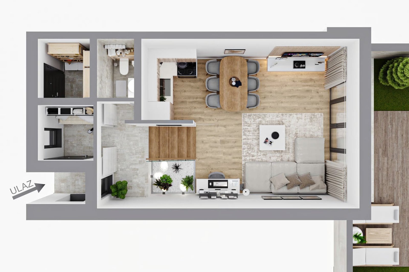 Aluminijumski kvalitetni profili. Okovi SIEGENIA visoke energetske klase. Stakla dvoslojna 4x16x4 mm, clima guard four season. Sigurnosna ulazna vrata sa drvo dezenom.